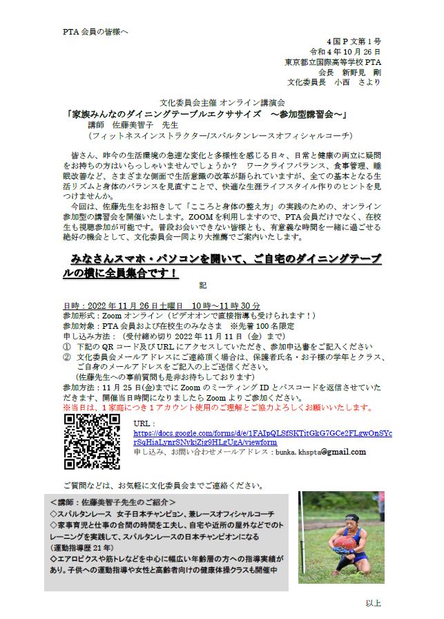 やり遂げたあとの達成感や仲間との一体感はやらないと得られないことだと思います。子ども達が学校生活を楽しんでいる大切な 3 年間を私たち保護者も PTA 活動を通して楽しく過ごすことで、親子で一緒に国際高校で充実した時間を過ごしている気持ちになれます。