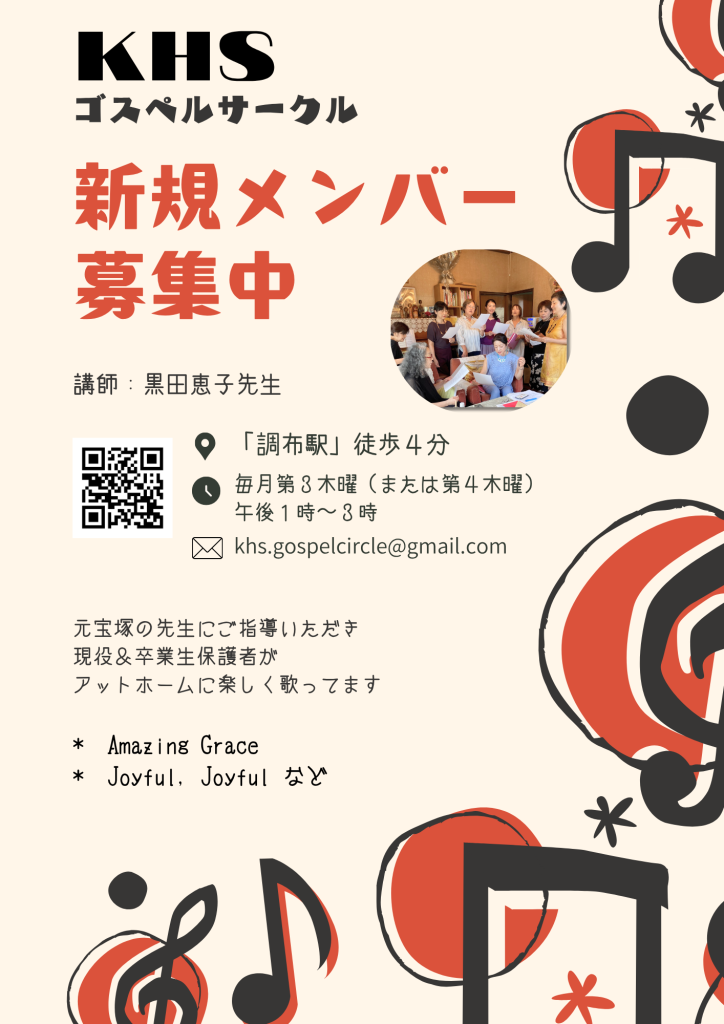 毎月第3木曜日(13時~15時)、場所は調布駅近く。お問い合わせはkhs.gospelcircle@gmail.comまで。